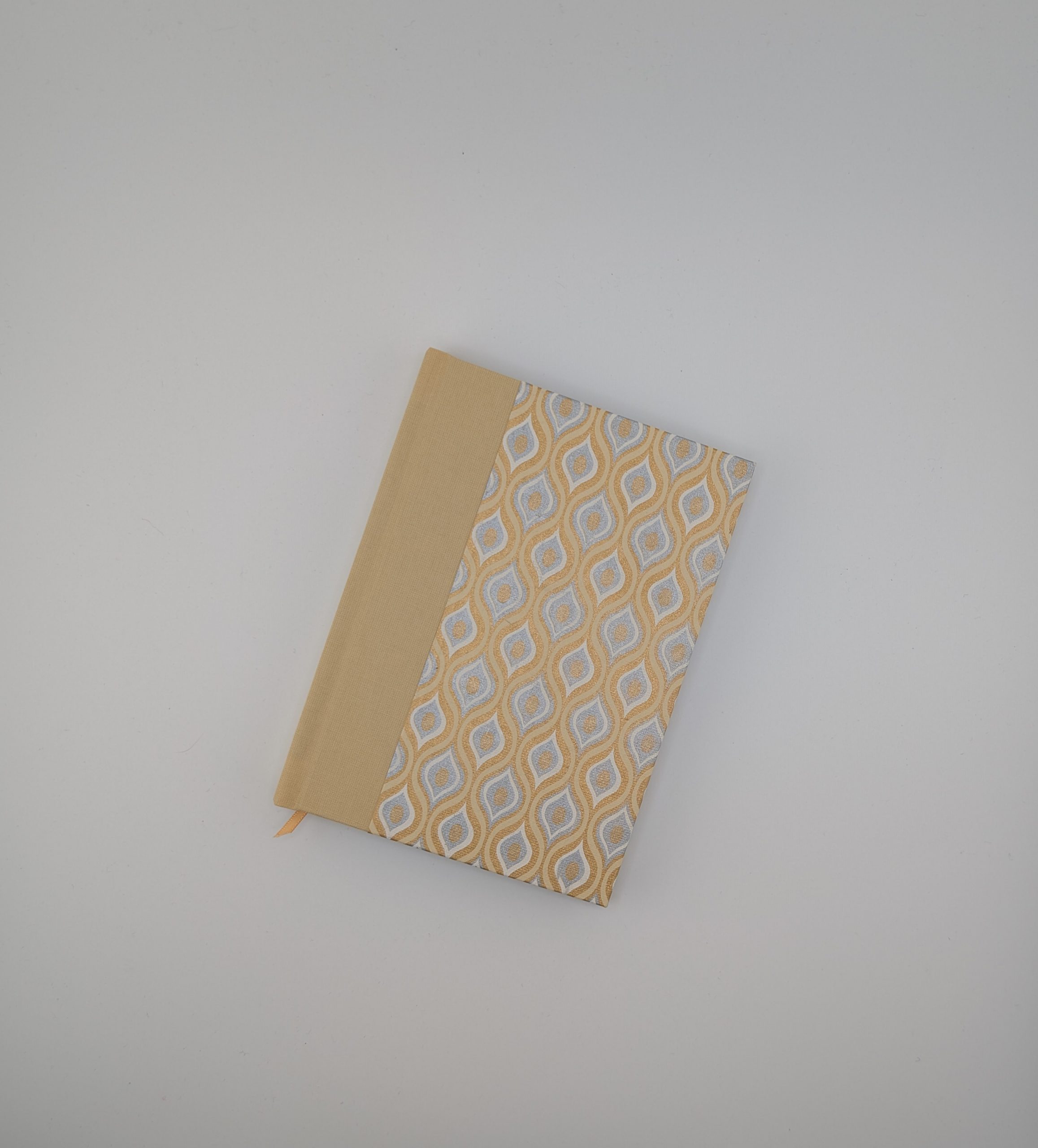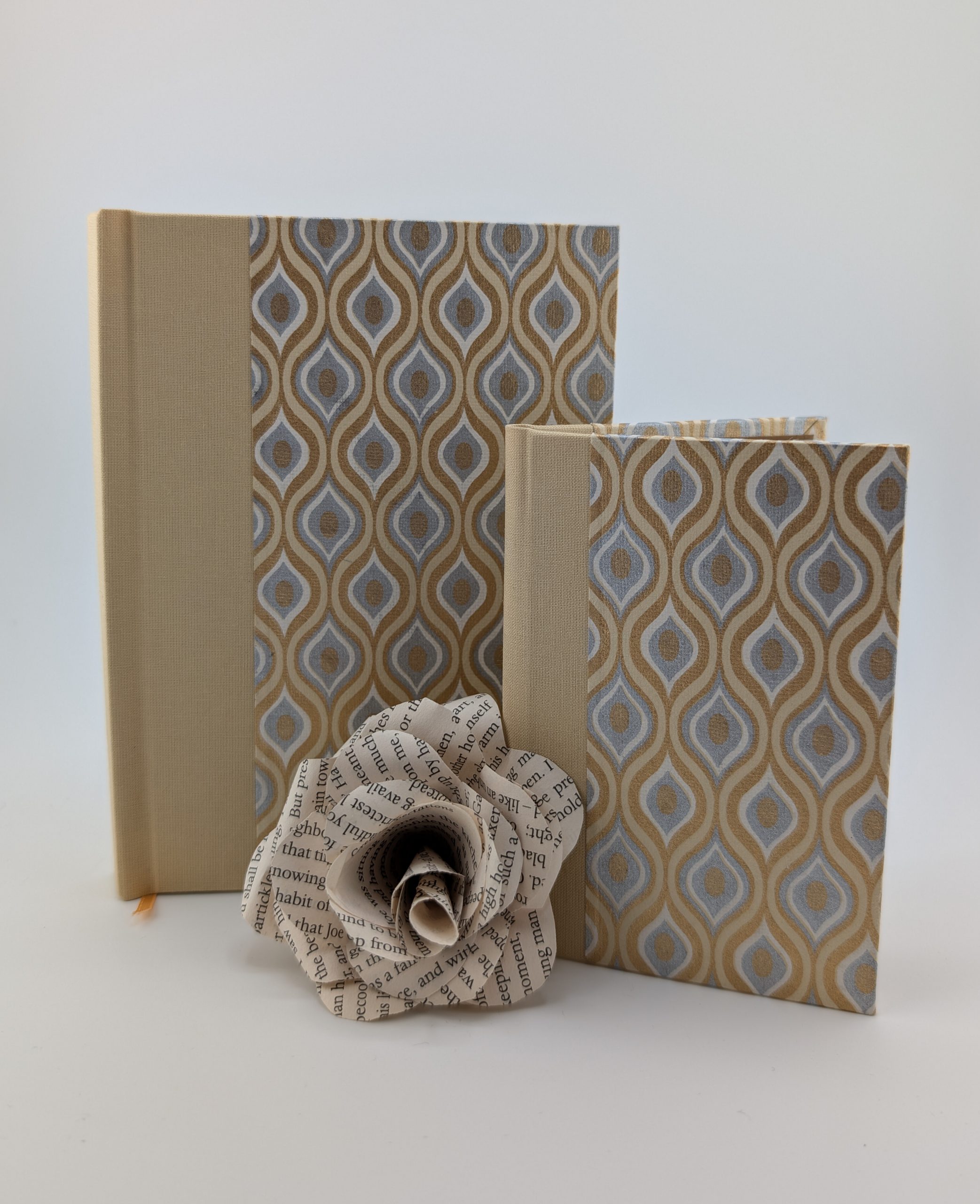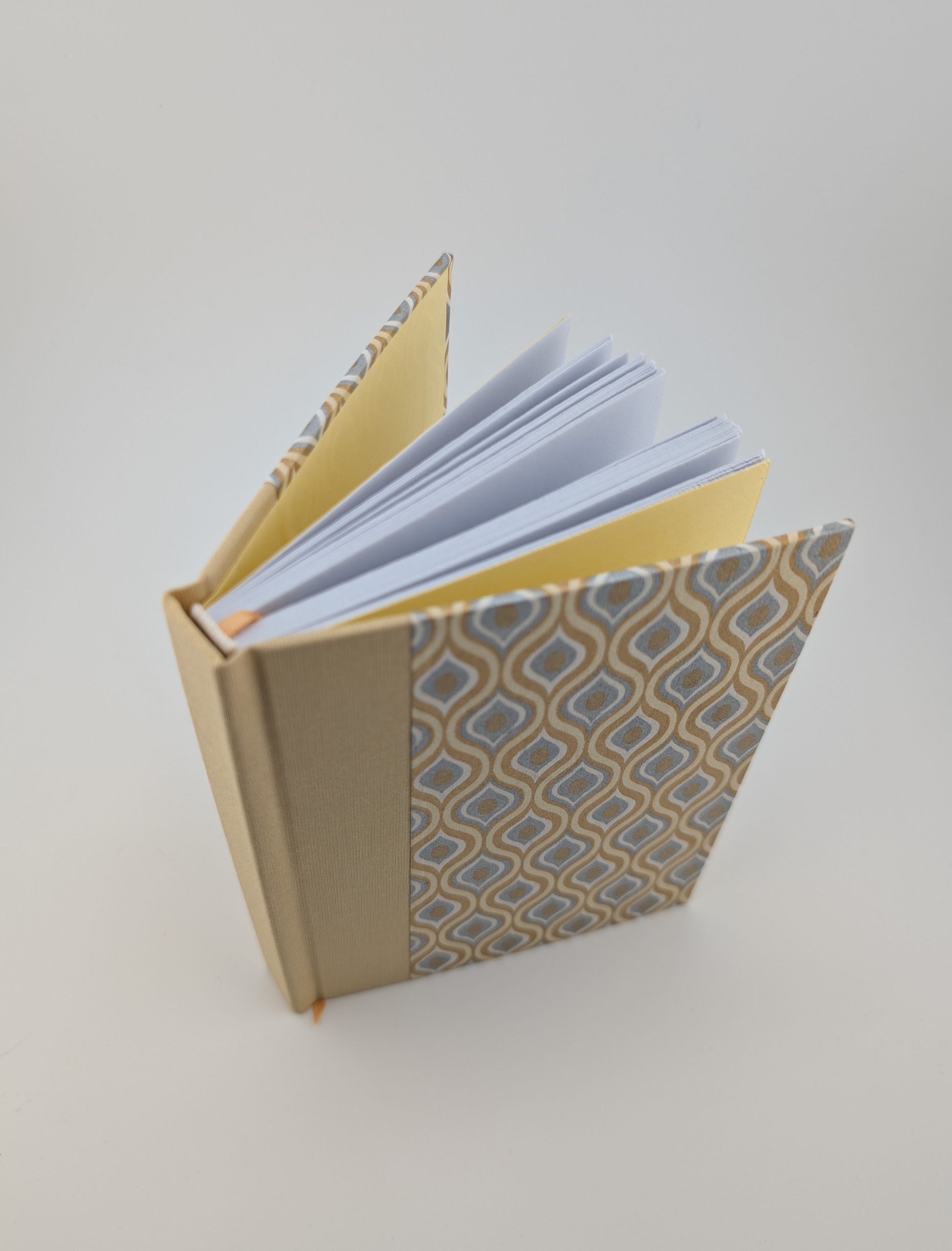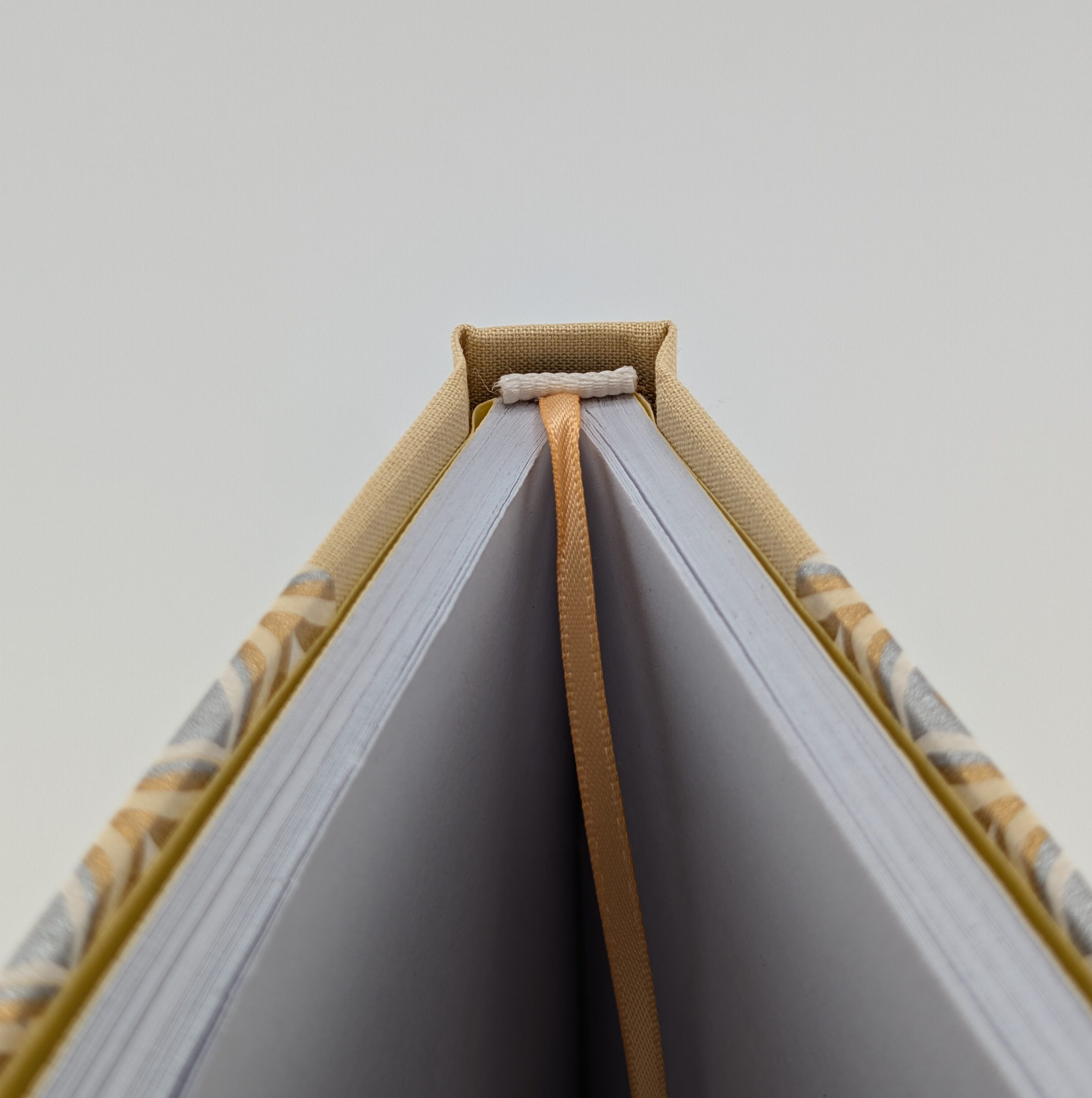 This book has 64 pages (128 sides) of 120gsm recycled paper, it is cased into a cover made from recycled board, traditional cream bookcloth and a beautiful lotus design in rich cream, silver and gold. The book has coordinating cream end papers, headbanding and a satin page marker.
