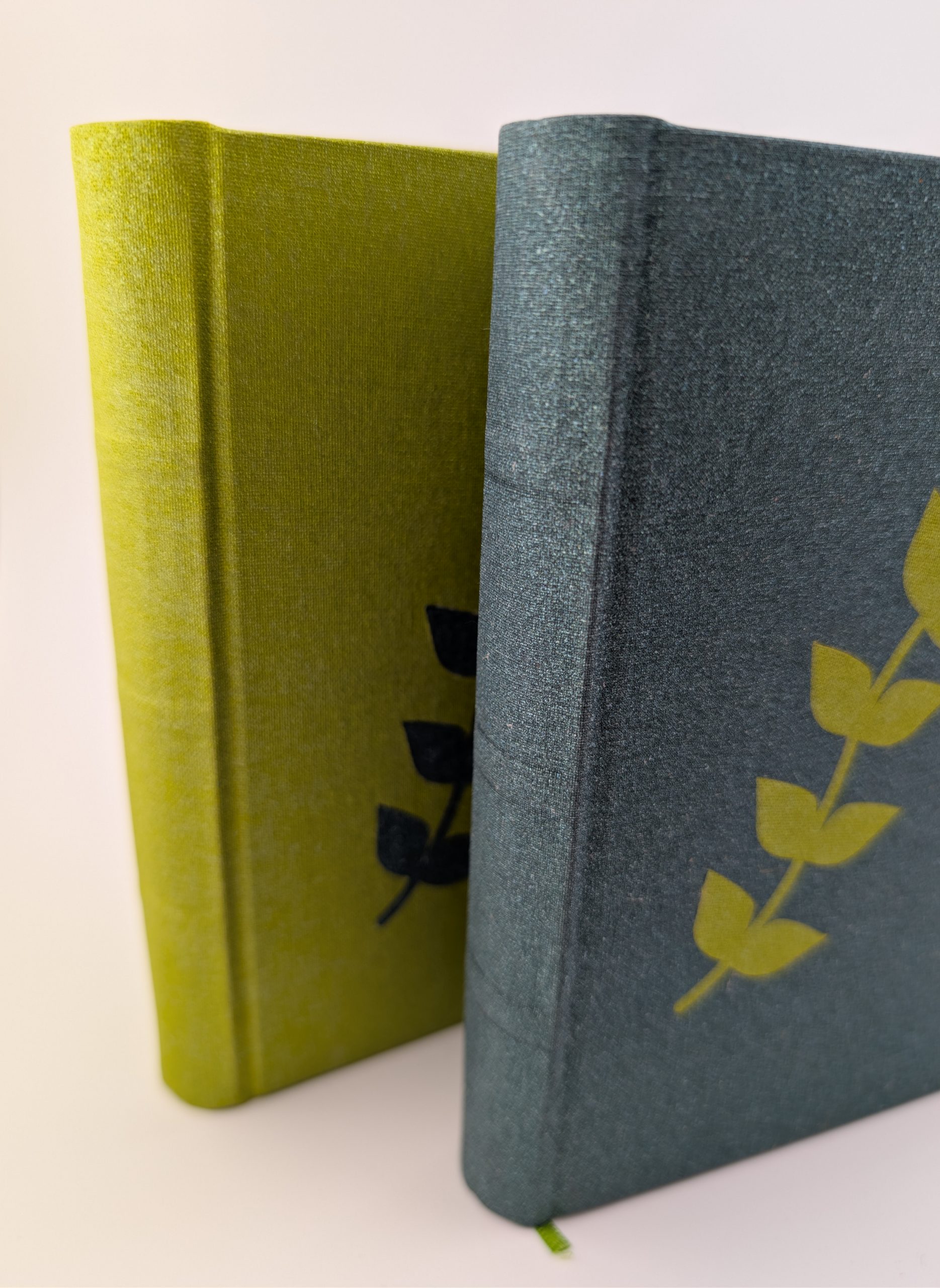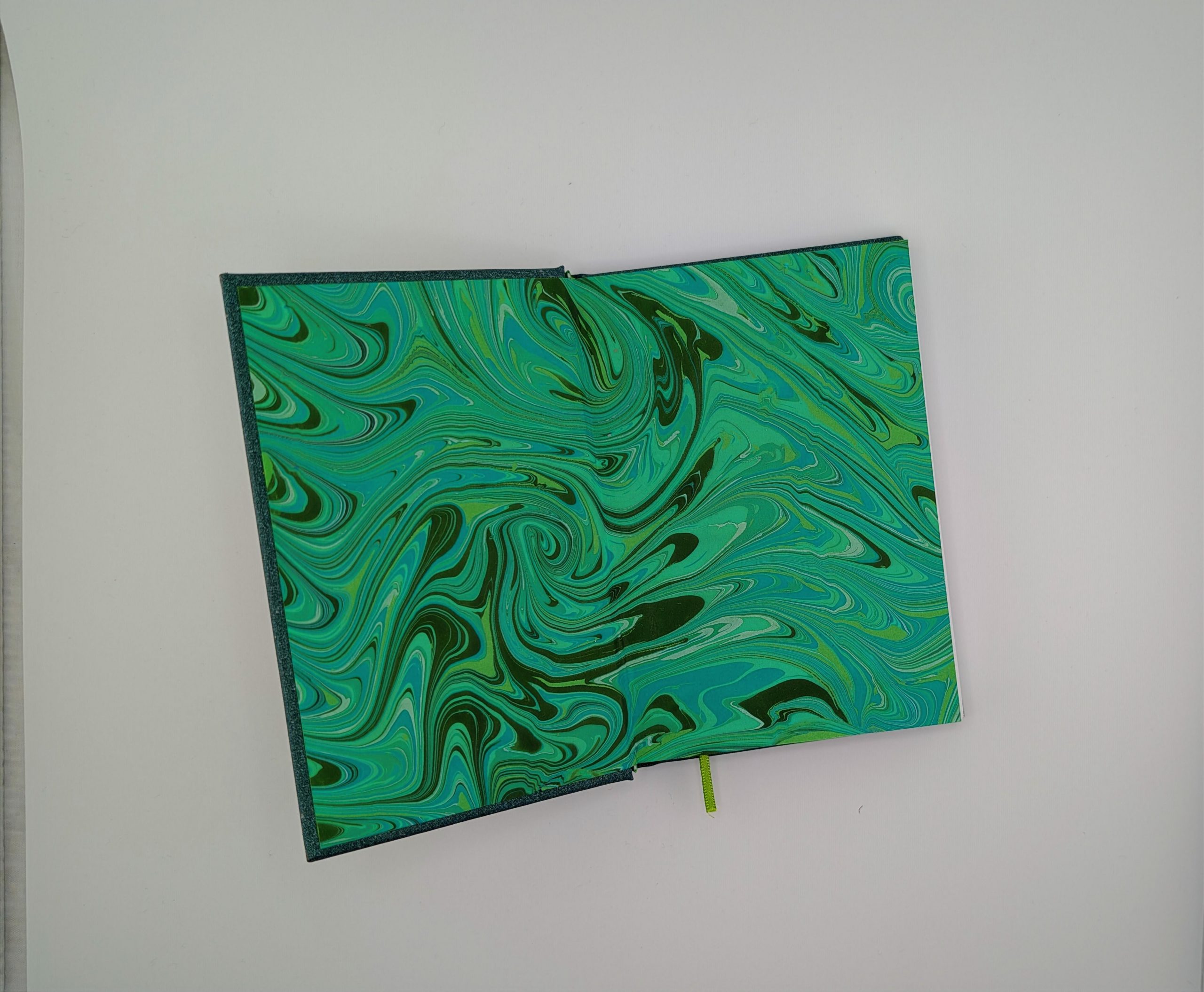 This journal was cut, folded, trimmed, sewn and glued using the same traditional methods employed by crafts men and women for hundreds of years. It has 80 pages (160 sides) of 120gsm recycled paper, the pages are blank. The journal is covered in modern dark green glittery bookcloth, the light green leaf design was cut from a contrasting green glittery cloth and inlayed on the front cover. It has raised detailing on the spine. The end papers are hand marbles by Tomasz Lipinski in a lovely green, and black design that compliments the cover. The book is sewn together using waxed linen thread, and the headbanding was handmade using the same marbled paper as the endpapers, the page marker is satin ribbon and coordinates with the light leaf on the cover.