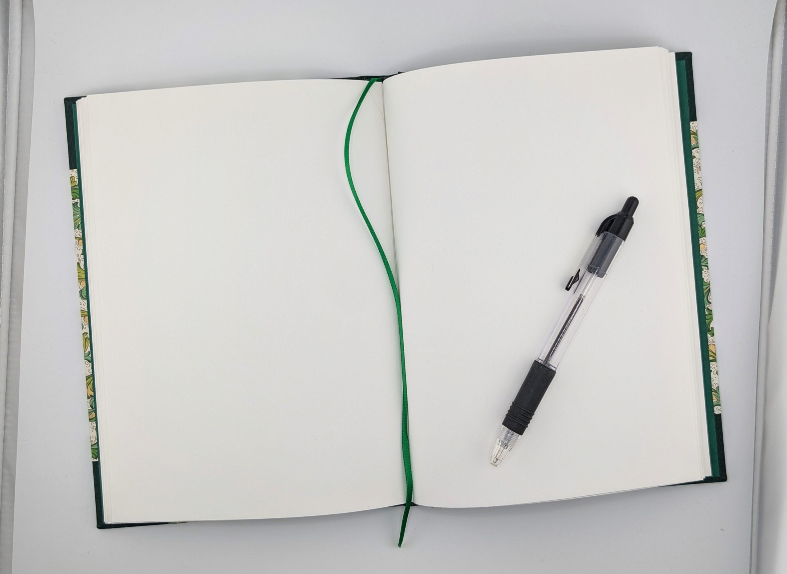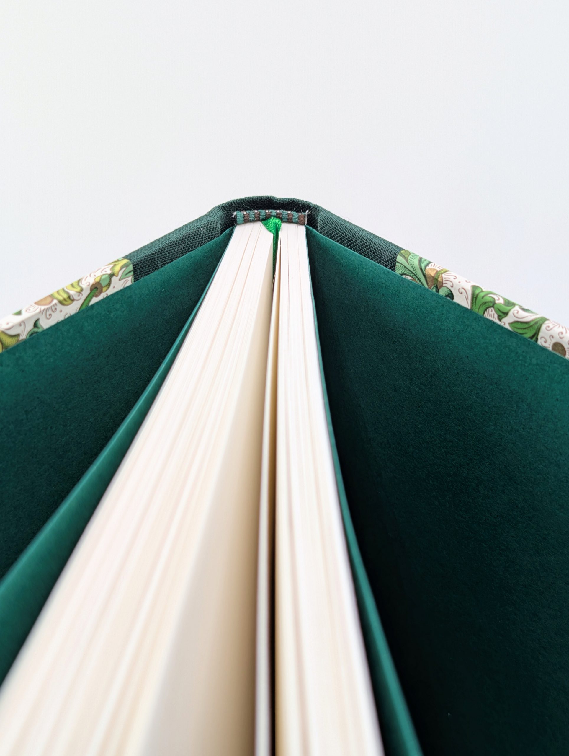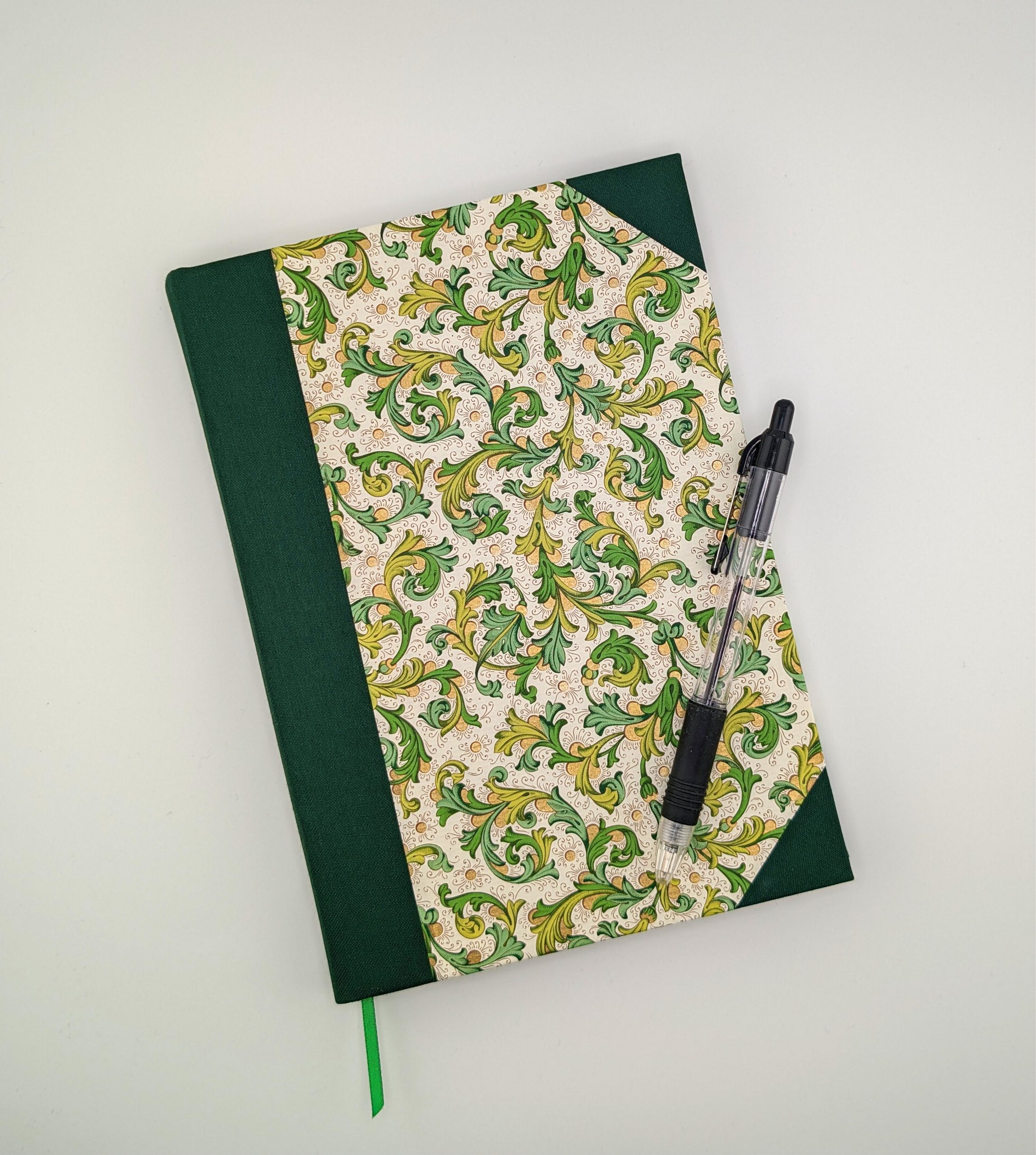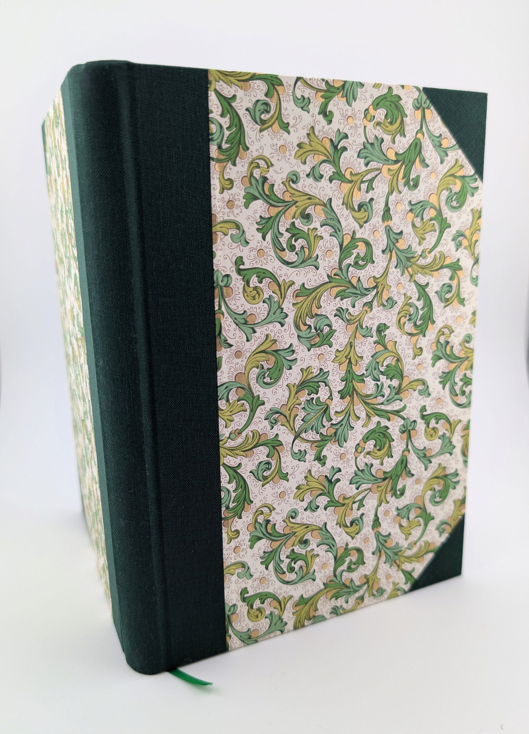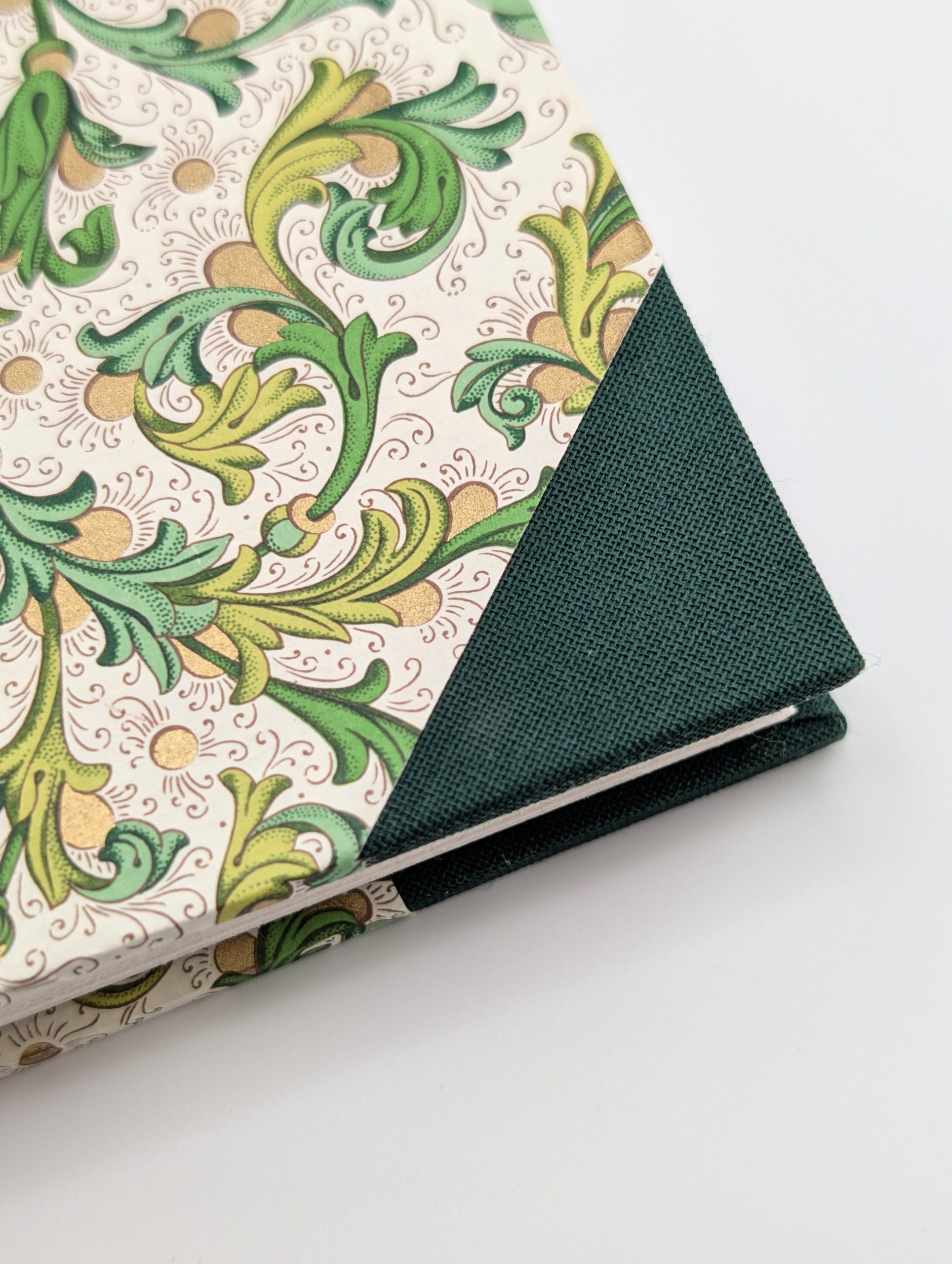 This stylish journal was cut, folded, trimmed, sewn and glued using the same traditional methods employed by craftsmen and women for hundreds of years. It has 80 pages (160 sides) of 120gsm quality paper, it is perfect for sketching as well as writing. The pages are blank, making it extremely versatile. This journal has been quarter bound, meaning it has bookcloth reinforced corners to its covers. This is a traditional form of binding which protects the book from wear and tear if it is stored on a bookshelf or regularly taken out of a bag, as well as being an attractive design feature. The spine and corners are covered in a traditional green bookcloth, the cover is made from recycled board and covered in a wonderful flowing green and gold Florentine design. It is sewn together using wax coated linen thread. It has green endpapers, and green and black headbanding, the black page marker is green satin ribbon.