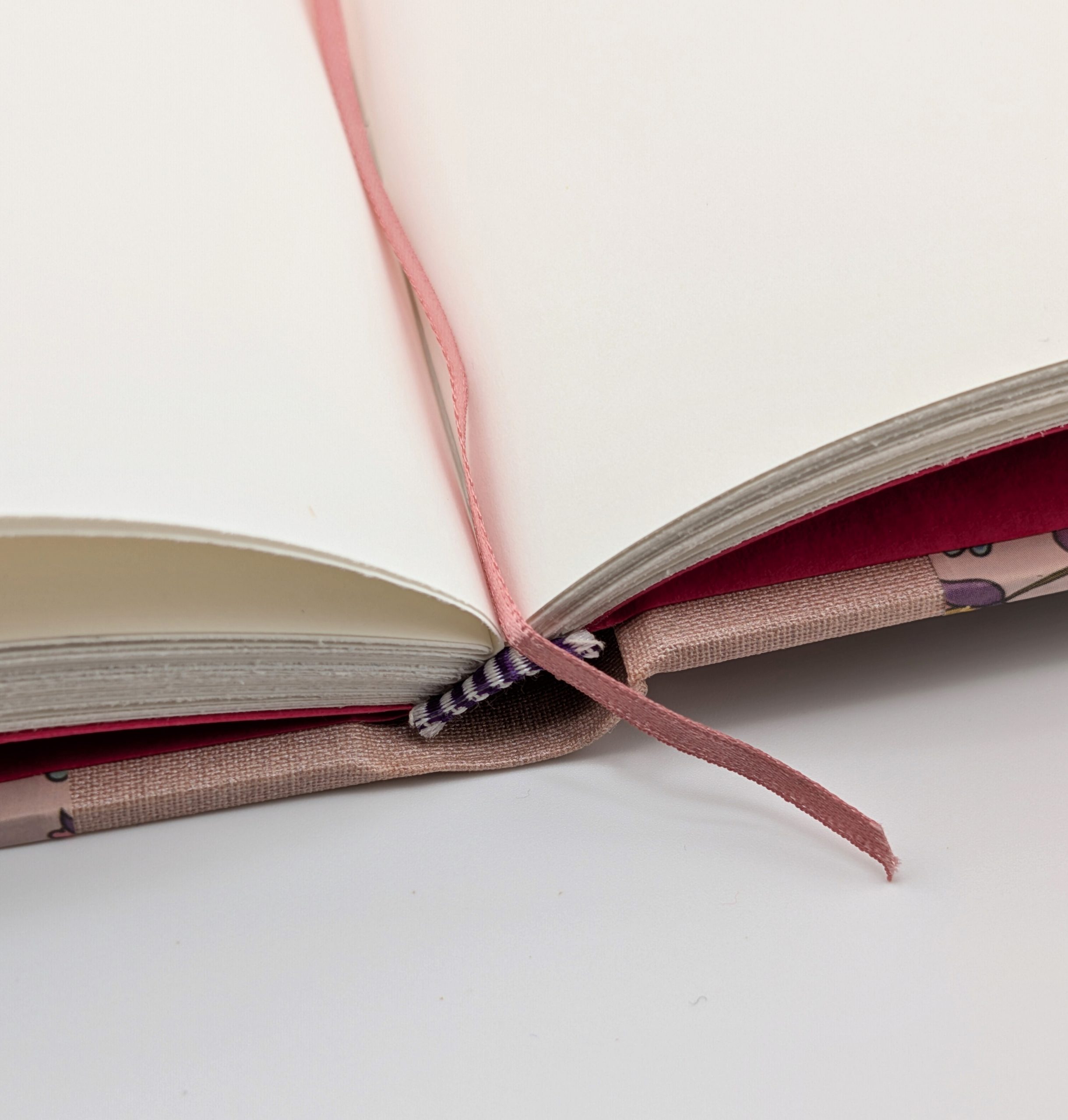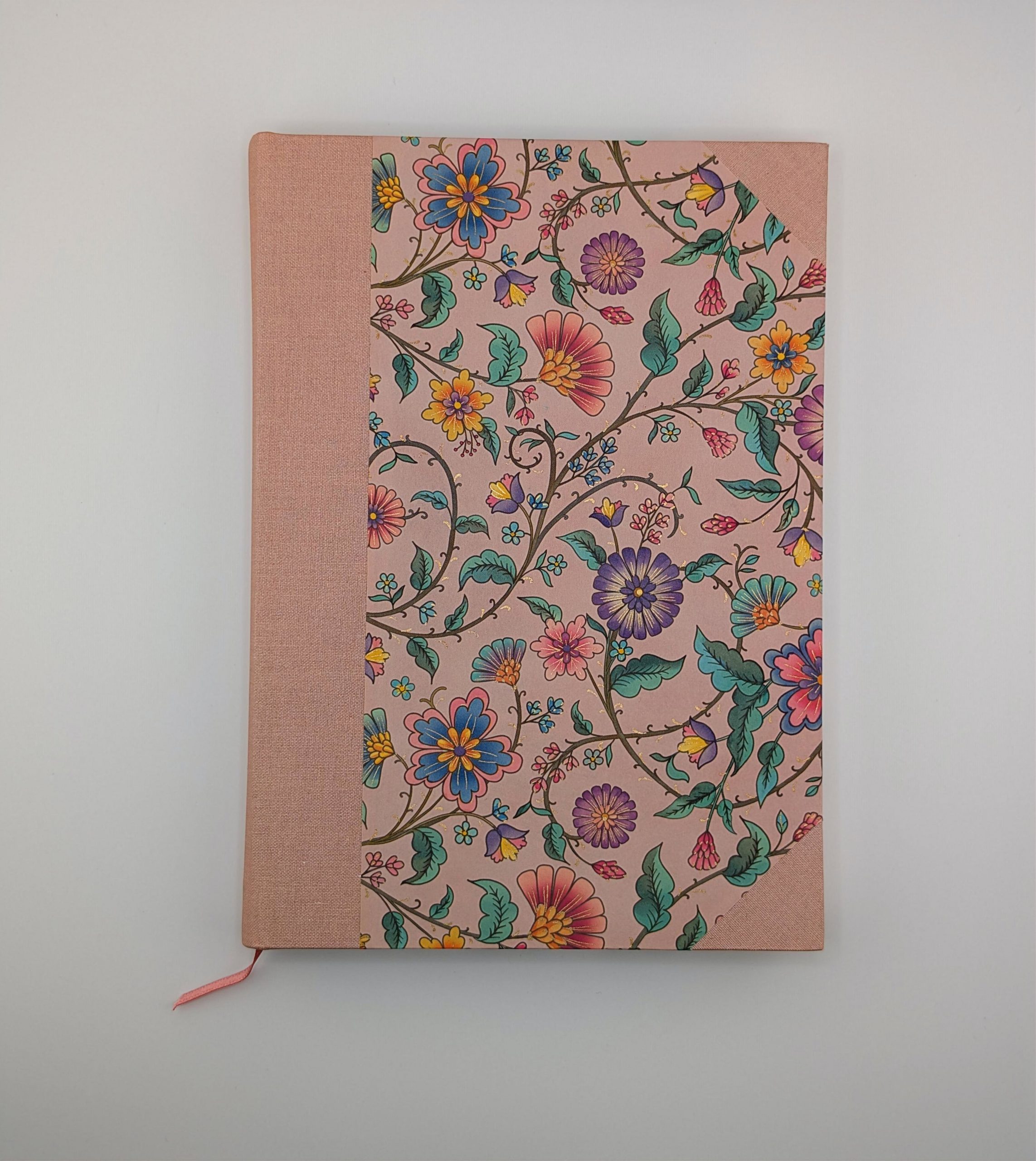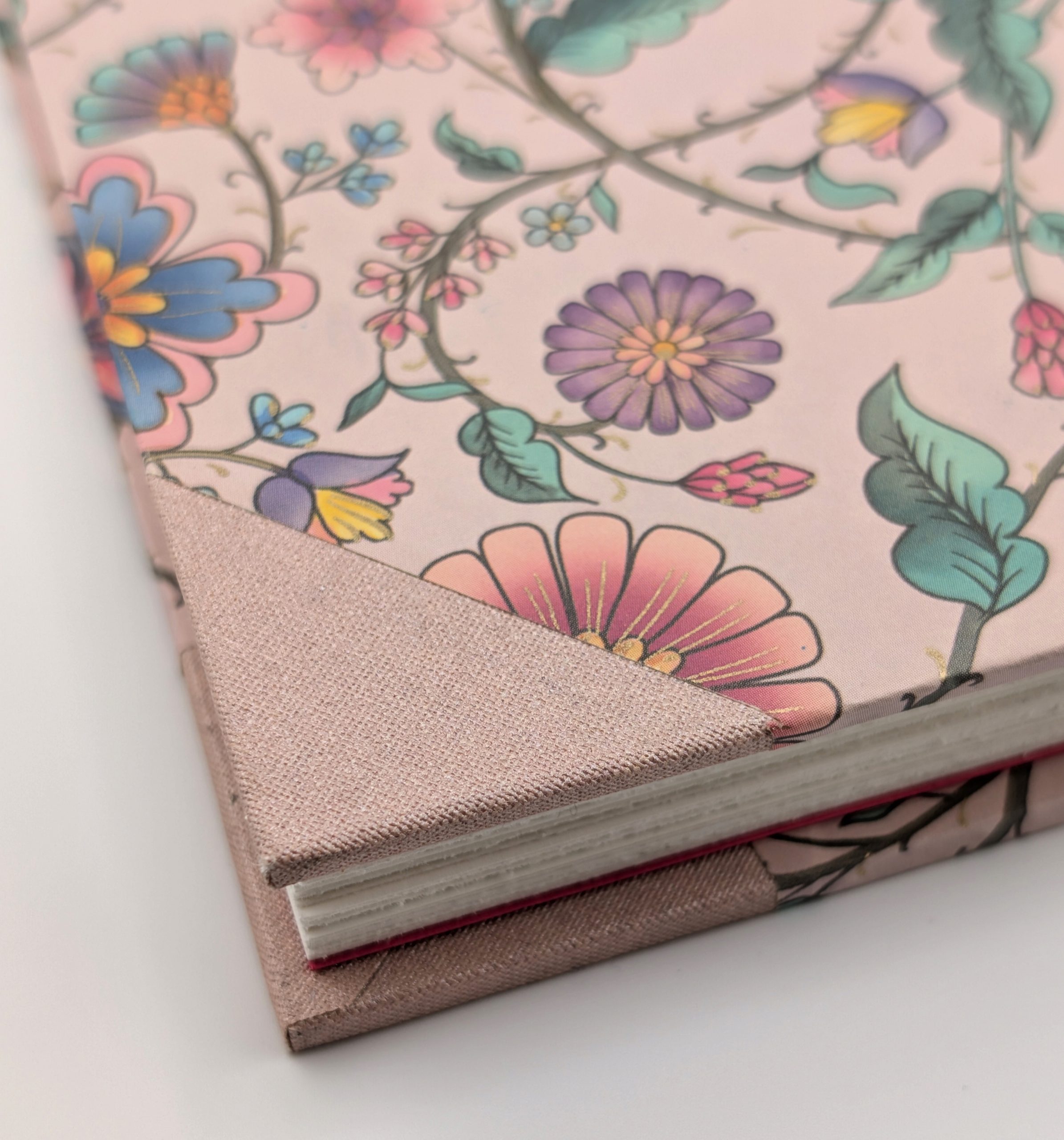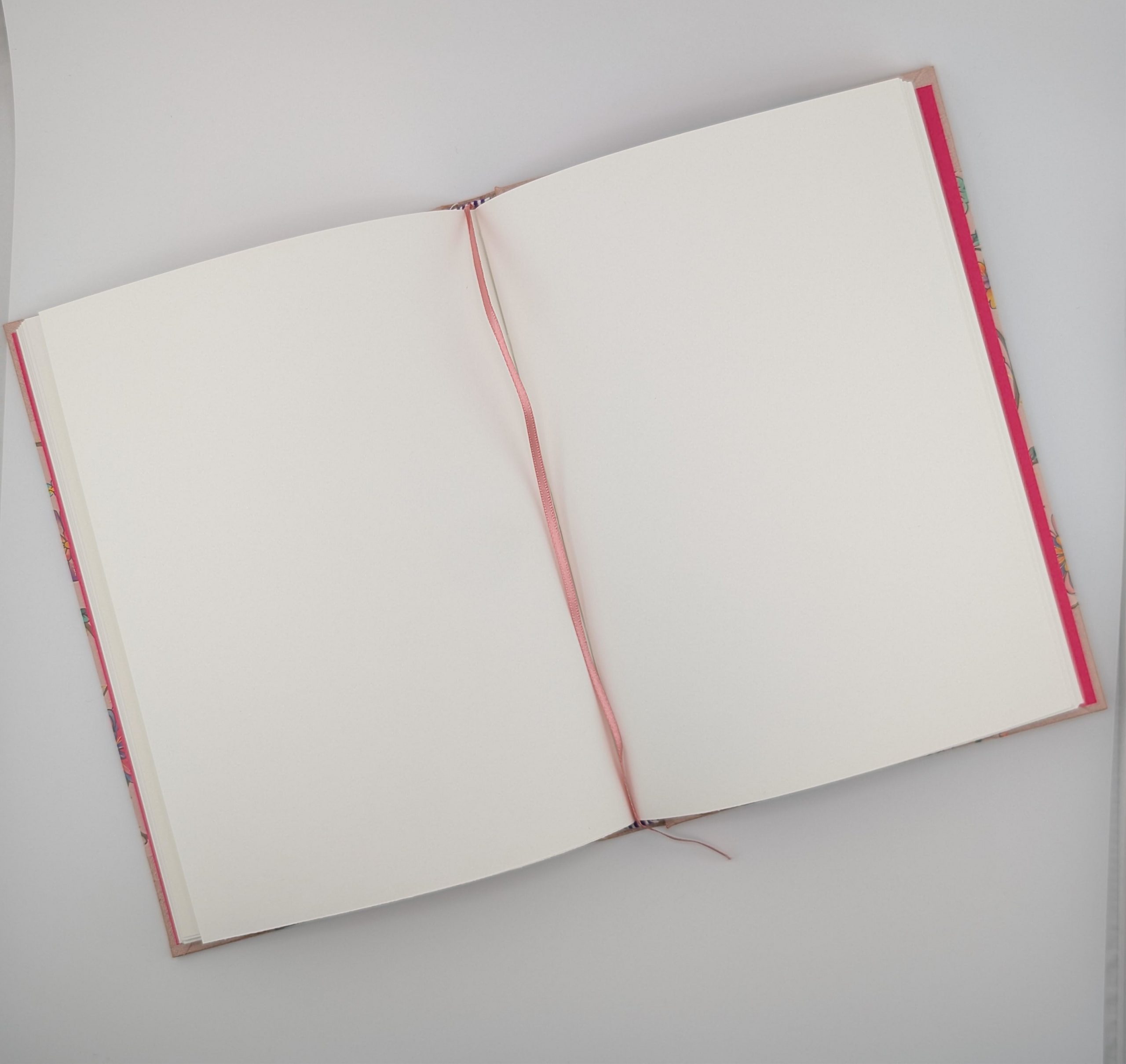 This book has 80 pages (160 sides) of 120gsm recycled paper, it is cased into a cover made from recycled board, traditional bookcloth and a fun floral design in pink, with quarter bound corners. This is a traditional design element which protects the corners of your book when handling as well as being a beautiful design feature. The book has coordinating end papers, headbanding and a pink satin page marker.