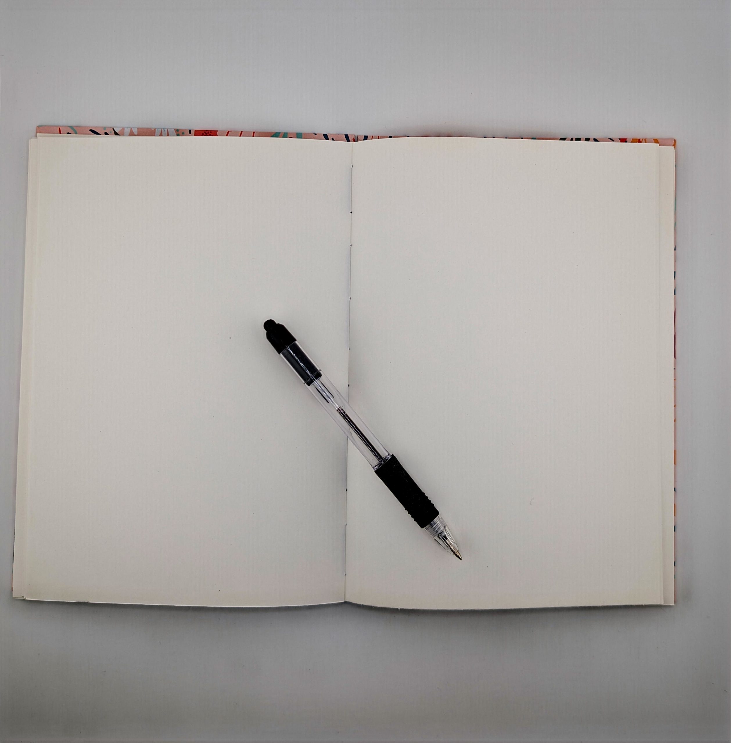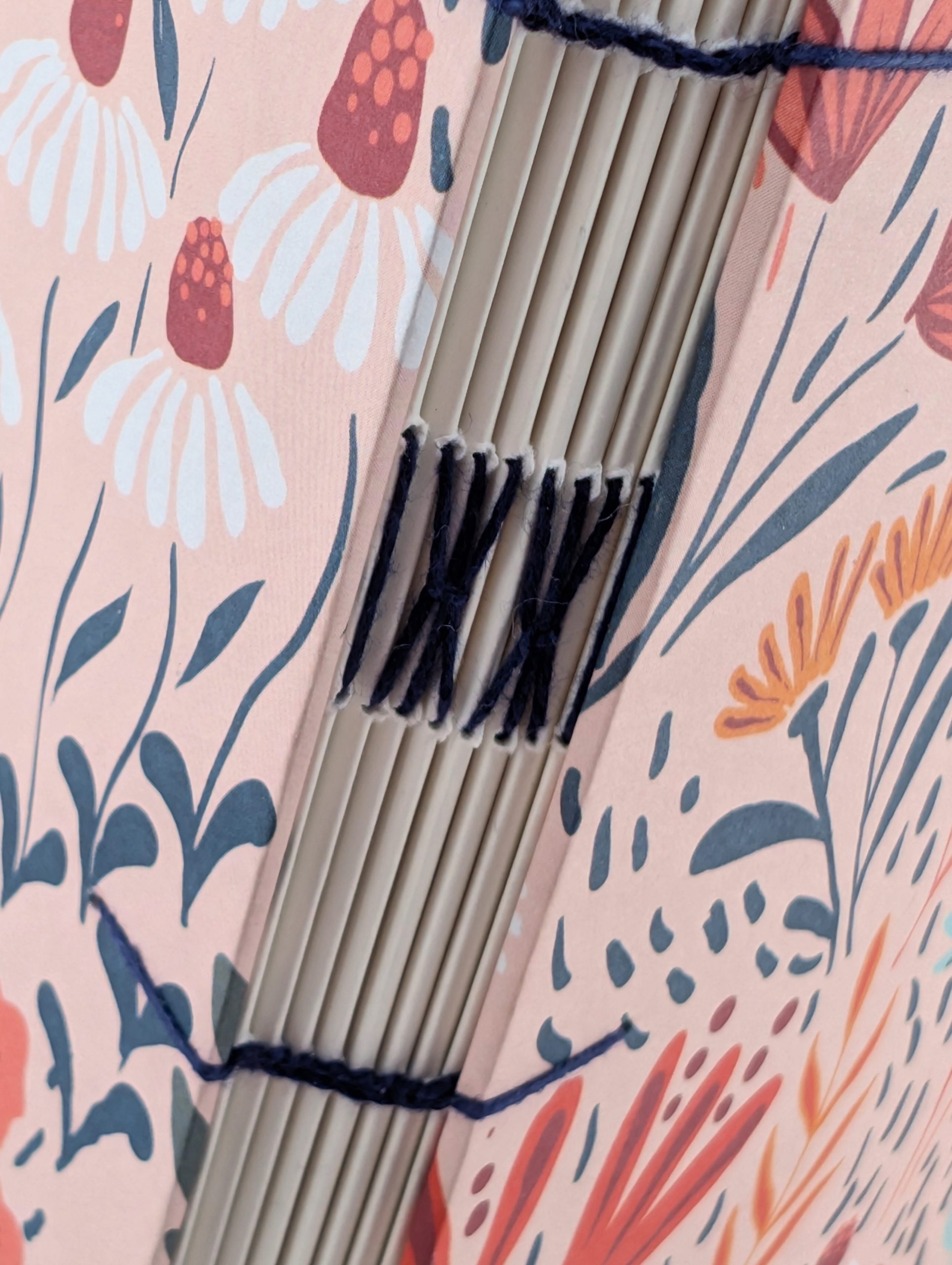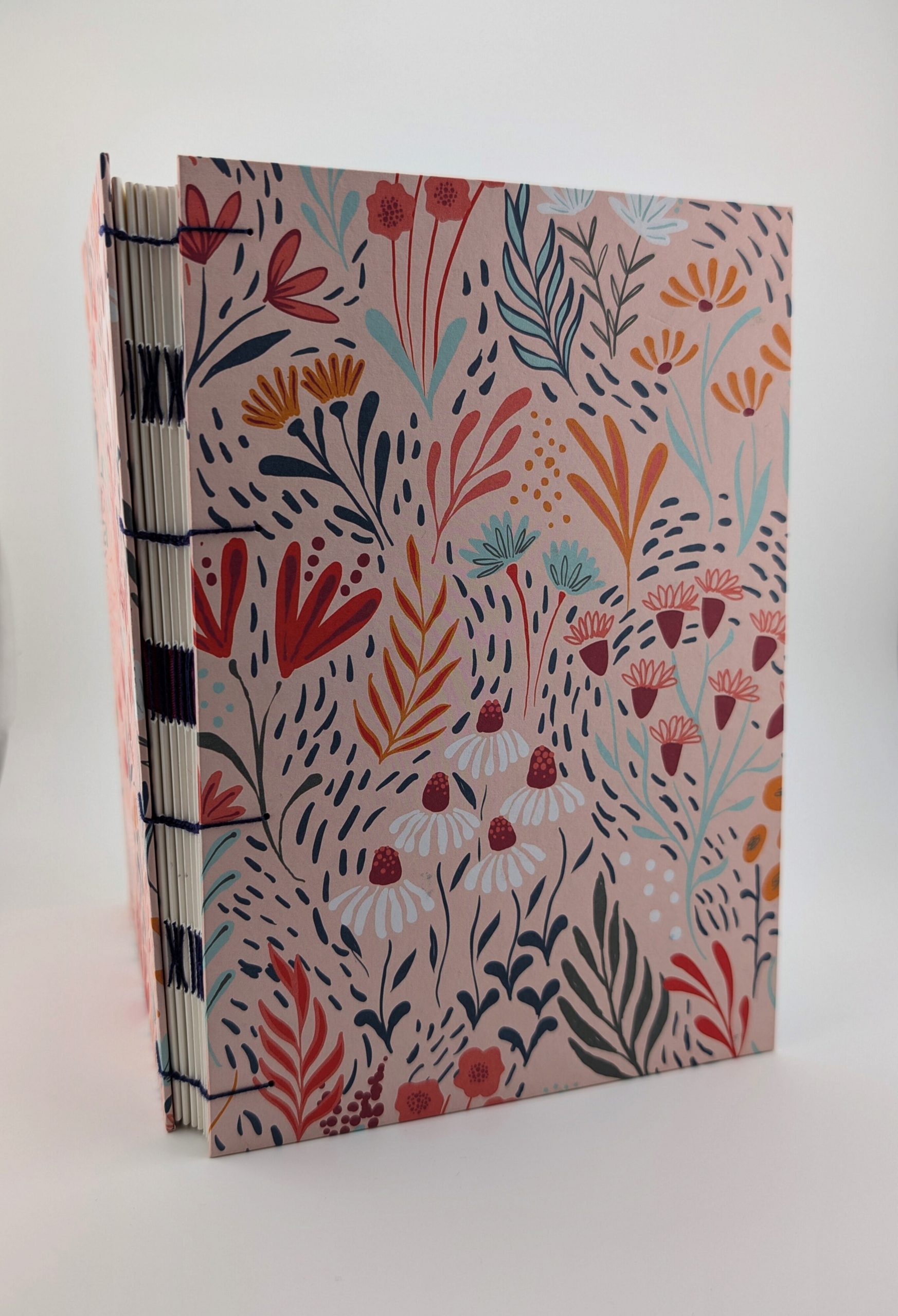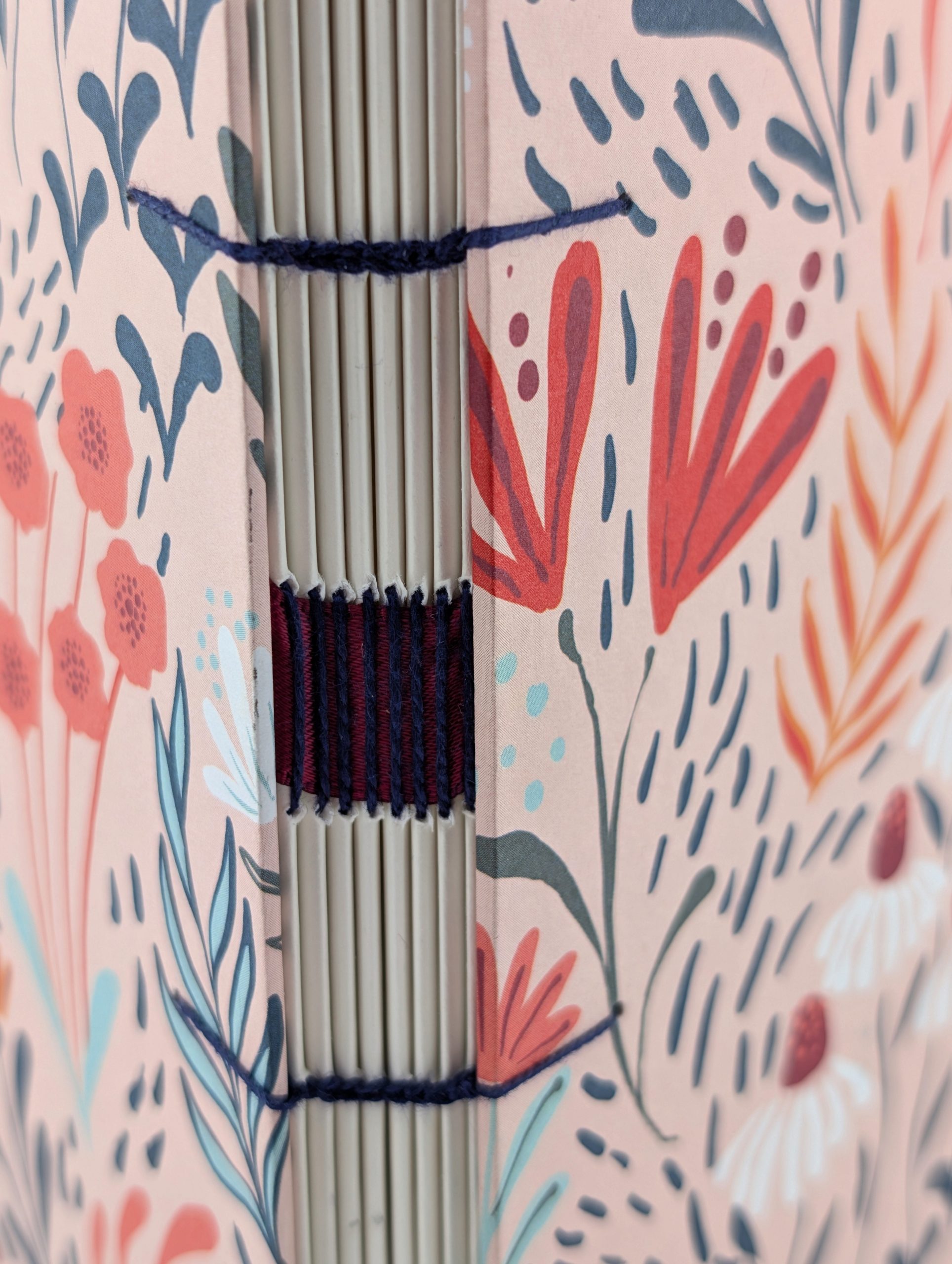 This book has 80 pages (160 sides) of 120gsm recycled paper, it is sewn into covers made from recycled board, overlaid with a modern wild flower design in pink. It is sewn using navy blue wax coated thread using a mix of coptic and decorative stitches.