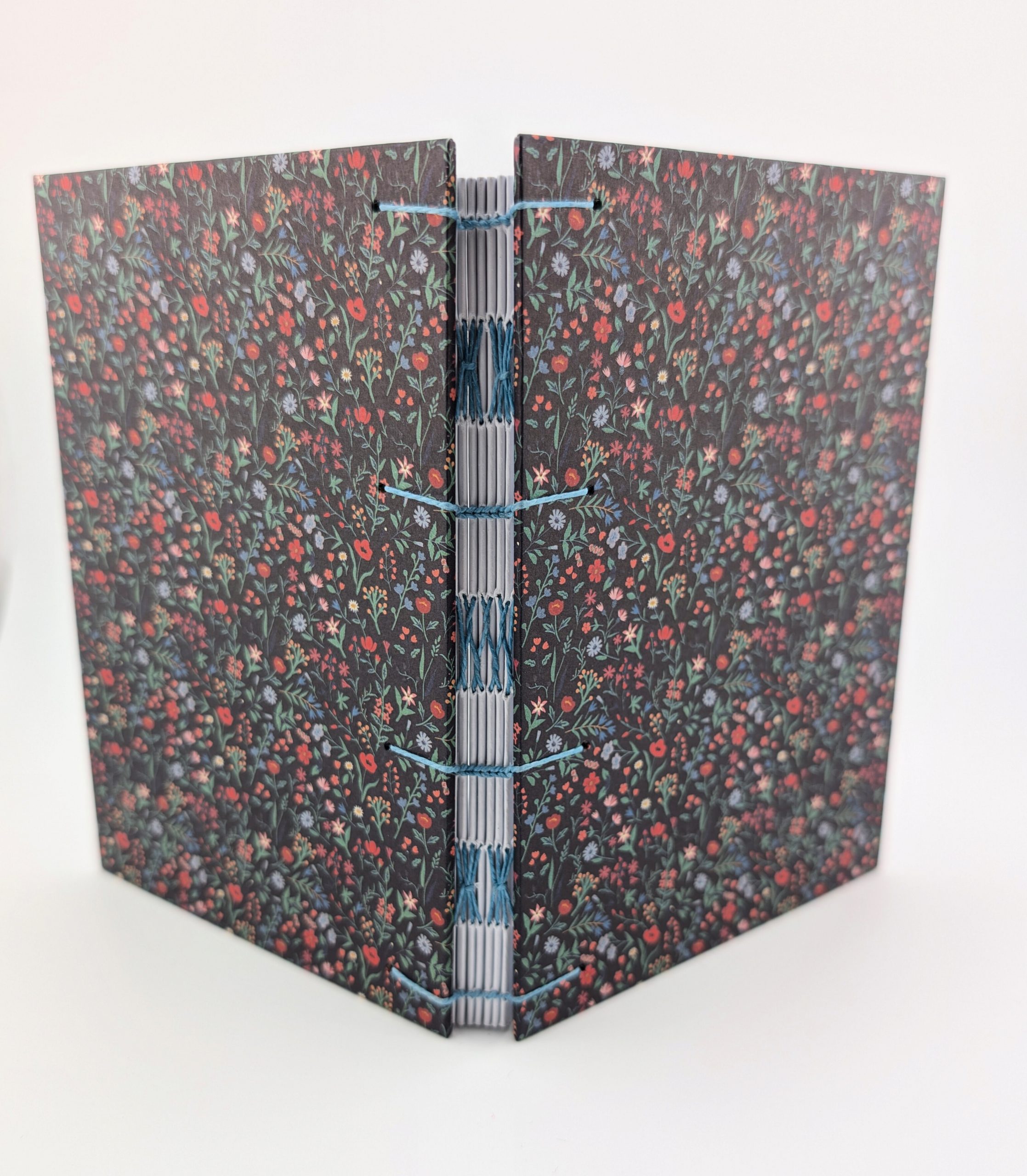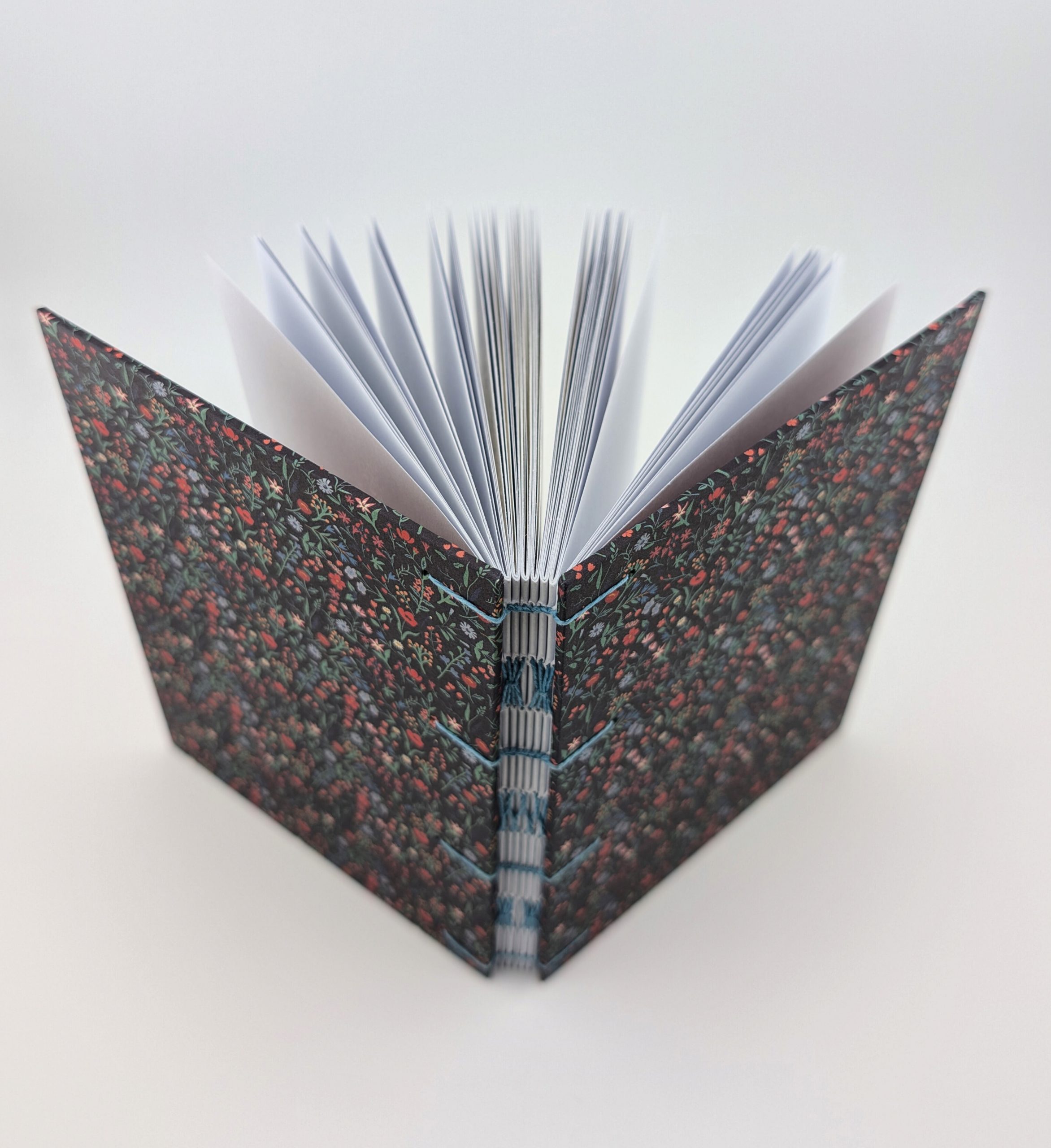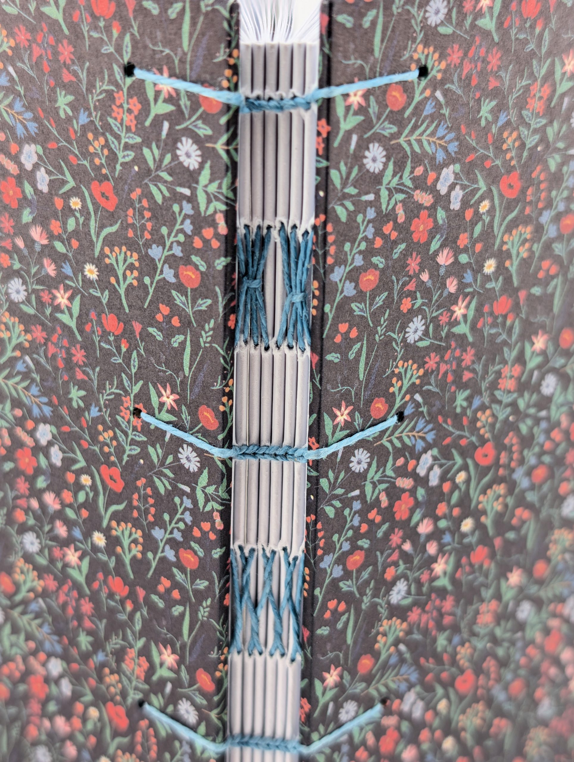 This book has 64 pages (128 sides) of 120gsm recycled paper, it is sewn into covers made from recycled board, overlaid with a pretty design of tiny colourful flowers. It is sewn using blue wax coated thread using a mix of coptic and decorative stitches.